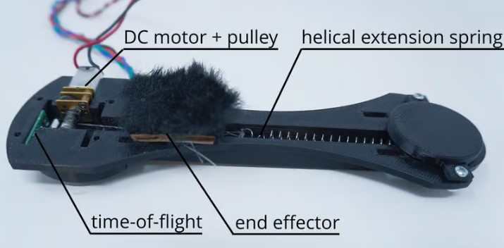 Устройство использует пружины и электрический привод для медленного перемещения куска синтетического меха вперед и назад по коже.
