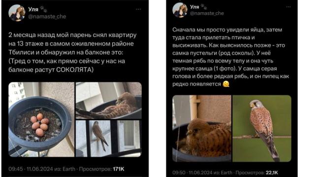 У молодой пары на балконе выросли соколята. Девушка Уля написала тред о том, с чего это все начиналось.
